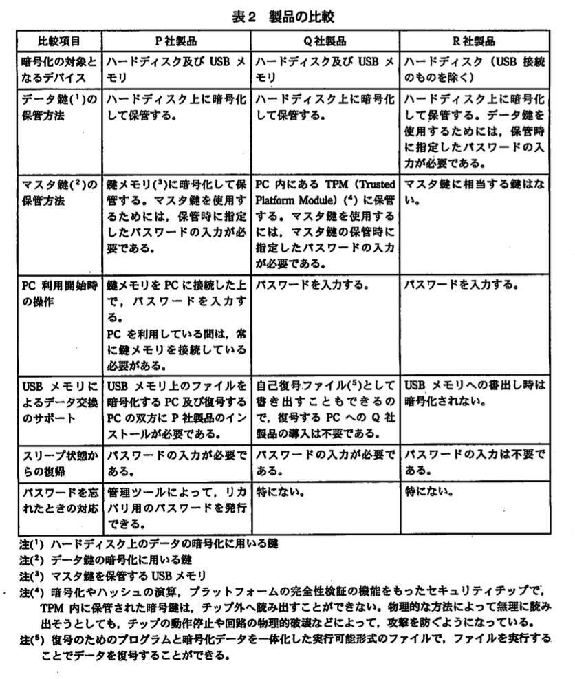対策チームは、ハードディスク全体を暗号化できる製品の選定を進めた。 H氏から実績が豊富な製品として挙げられた P 社、Q社及びR 社の製品が候補となった。 いずれも、NPCの起動時にパスワードを入力することによって、暗号化されたハードディスクにアクセスできるようになるという製品である。 表 2は各社の製品の比較表である。