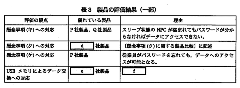 対策チームは、表1に挙げられた(キ), (ク), (ケ)といった懸念事項を中心に各社の製品を評価し、結果を表3にまとめた。