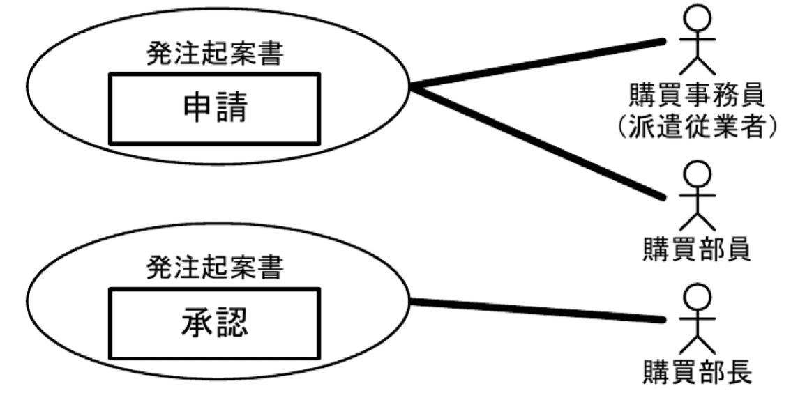 - 図2では“発注起案書処理”に対し、すべてのアクタ(「購買事務員(派遣従業者)」「購買部員」「購買部長」)に ○ が付いており、申請と承認を同一人物が実行できる状態である。