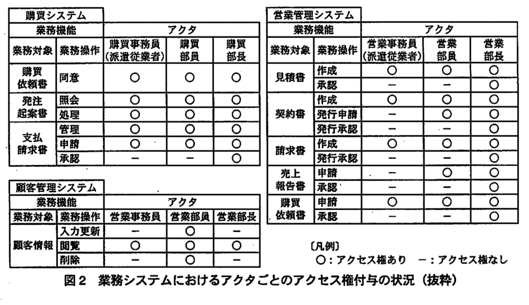 Pチームは調査結果を図2のとおり整理した。業務機能は、業務対象と業務操作から成っている。例えば、顧客管理システムでは、顧客情報という業務対象に対して入力更新という業務操作を行う業務機能があり、その業務機能に対するアクセス権が、アクタである営業部員に付与されている。営業管理システムにおいては営業部長に対して、購買システムにおいては購買部長に対して、すべての業務機能に対するアクセス権が付与されている。Pチームでは、営業部長及び購買部長に付与されているアクセス権が本当に必要なのかどうか、確認すべきであると考えた。