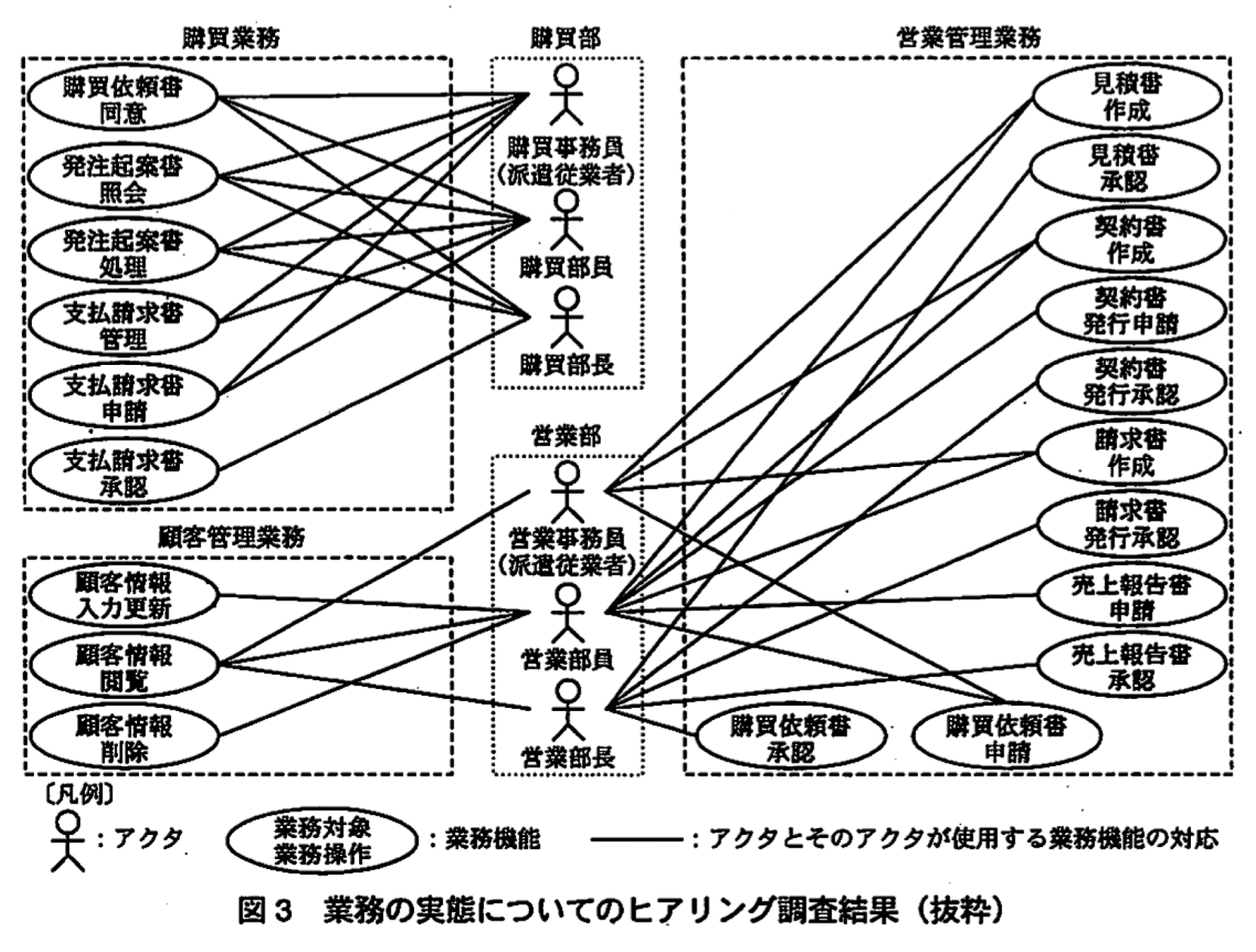 図3のユースケースは、業務システムの業務機能と、その業務機能を使用するアクタを示している。図3を職務規程と照らし合わせたところ、問題になる利用実態はなかった。