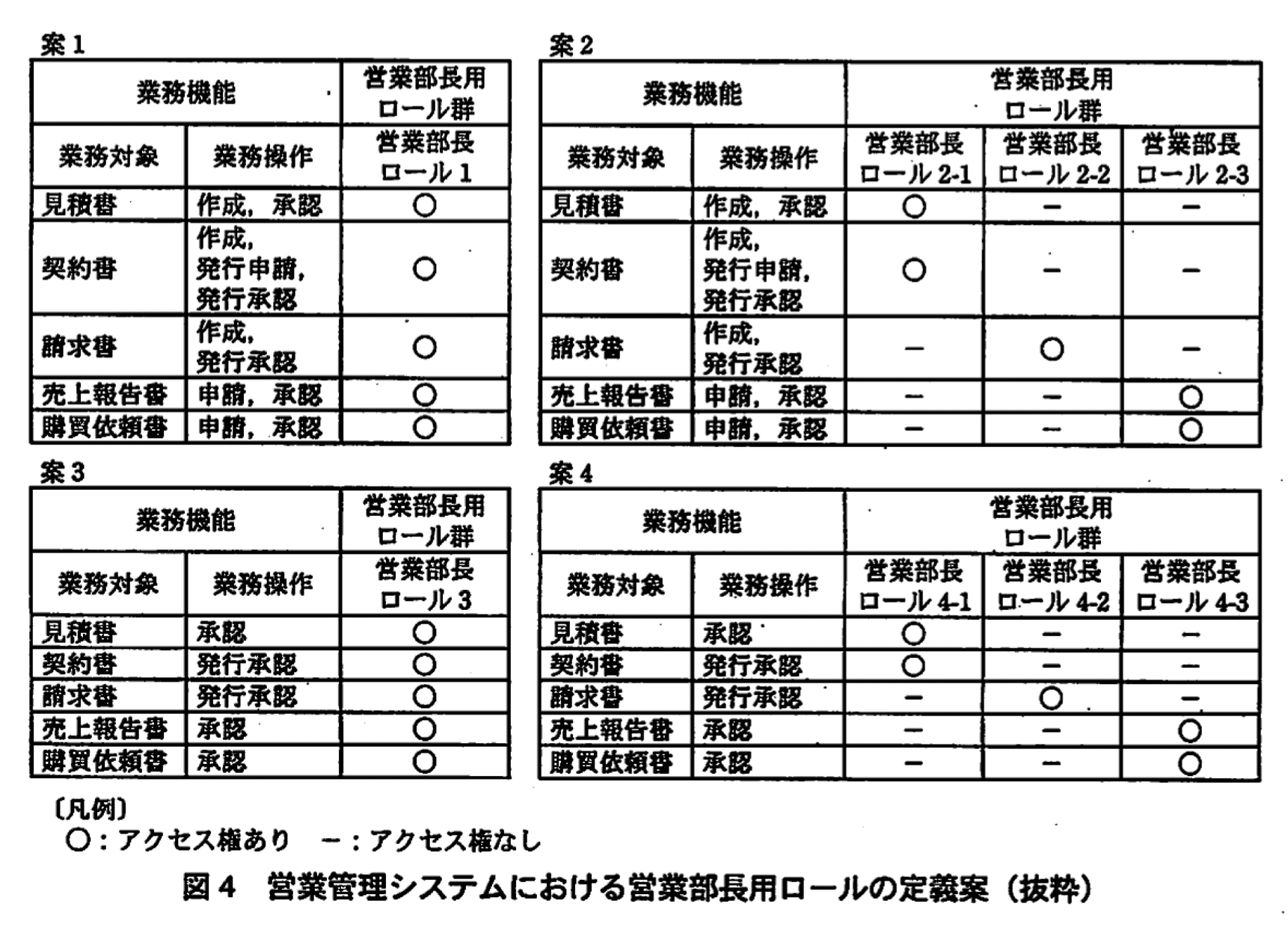Pチームでは、一つ以上の業務対象と一つ以上の業務操作との組合せに対するアクセス権をロールとして定義することにした。手始めに、営業管理システムにおける営業部長用のロールについて検討を行った。営業管理システムでは営業部長に一つ以上のロールが定義できると考え、図4に示す定義案を作成し、議論した結果、案4を採用することにした。