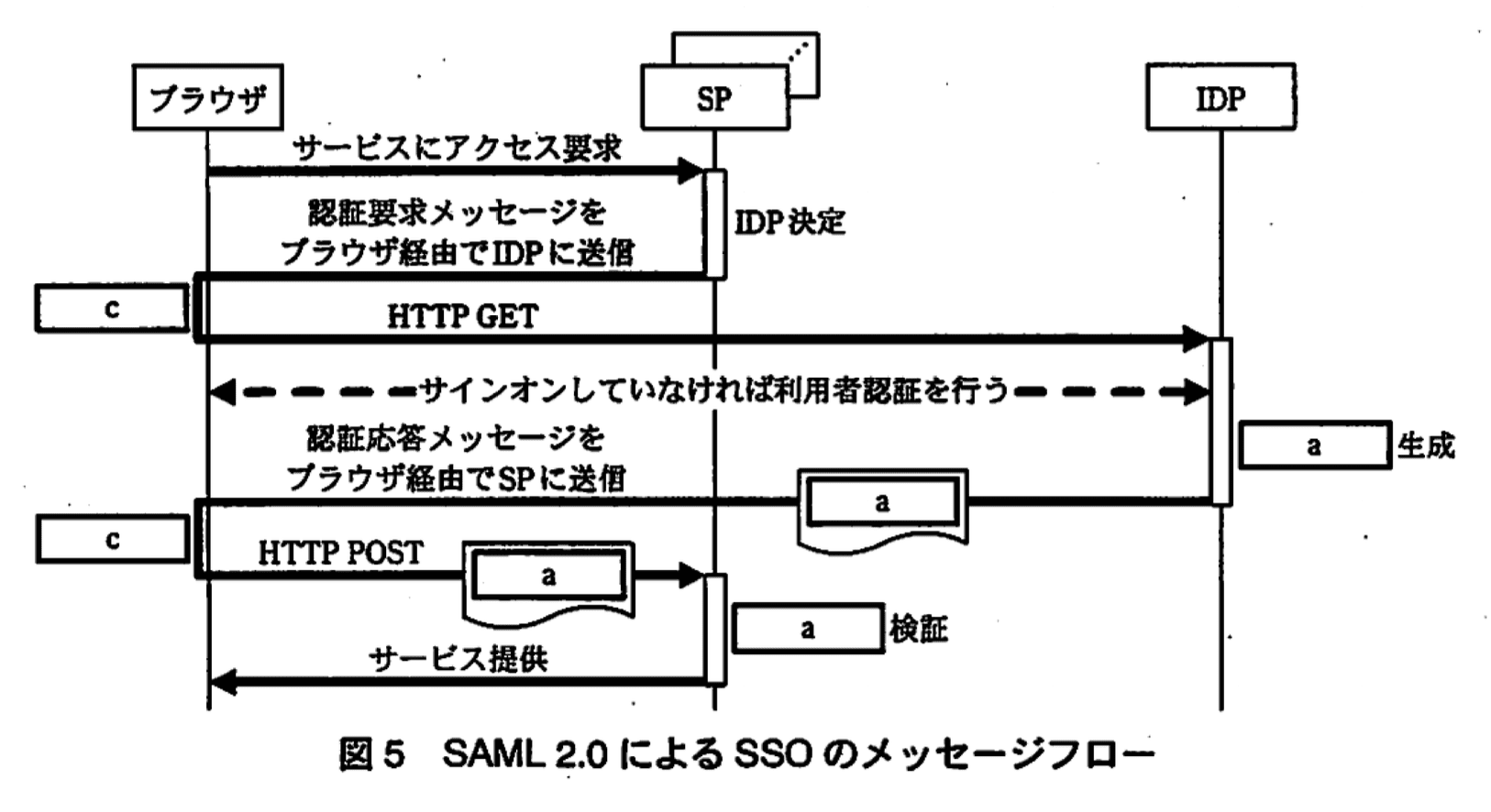 - 図5 では、SP→IDP へ「認証要求メッセージ」をブラウザ経由で送る際と、IDP→SP へ「認証応答メッセージ」を返す際に c が描かれています。
