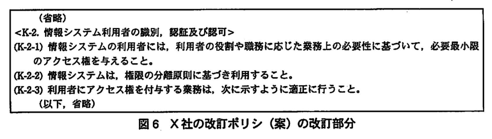 Pチームでは、セキュリティ強化及びITによる内部統制の強化を図り、認証・認可基盤との整合性を確保するために、X社の情報セキュリティポリシを改訂すべきであると考えた。図6に改訂した情報セキュリティポリシ(以下、改訂ポリシという)(案)の改訂部分を示す。改訂ポリシ(案)はPチームでの確認と情報システム部内での審査を経た後、経営会議で正式に承認され、2か月後に発効することになった。Pチームは、各業務システムに対して、発効後1年以内に改訂ポリシに準拠するように求めることとした。