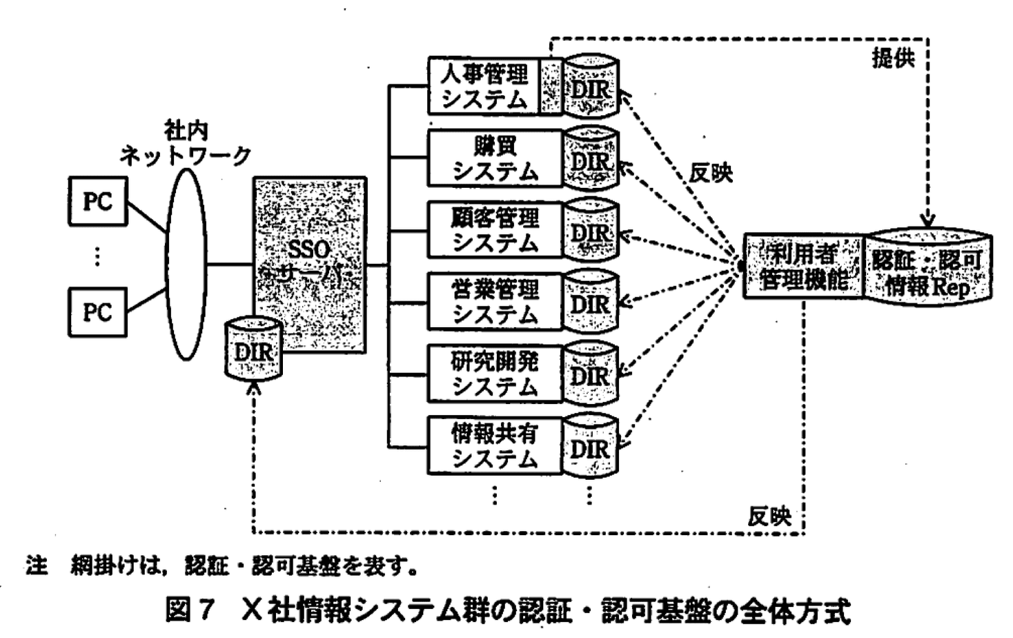 Hさん:総合的に考えて、図7に示す方式がよいと思います。人事管理システムから提供される利用者に関する情報と図4で検討したロールの定義を認証・認可情報リポジトリで一元管理します。それを利用者管理機能によって、SSOサーバと各業務システムのディレクトリに反映させます。