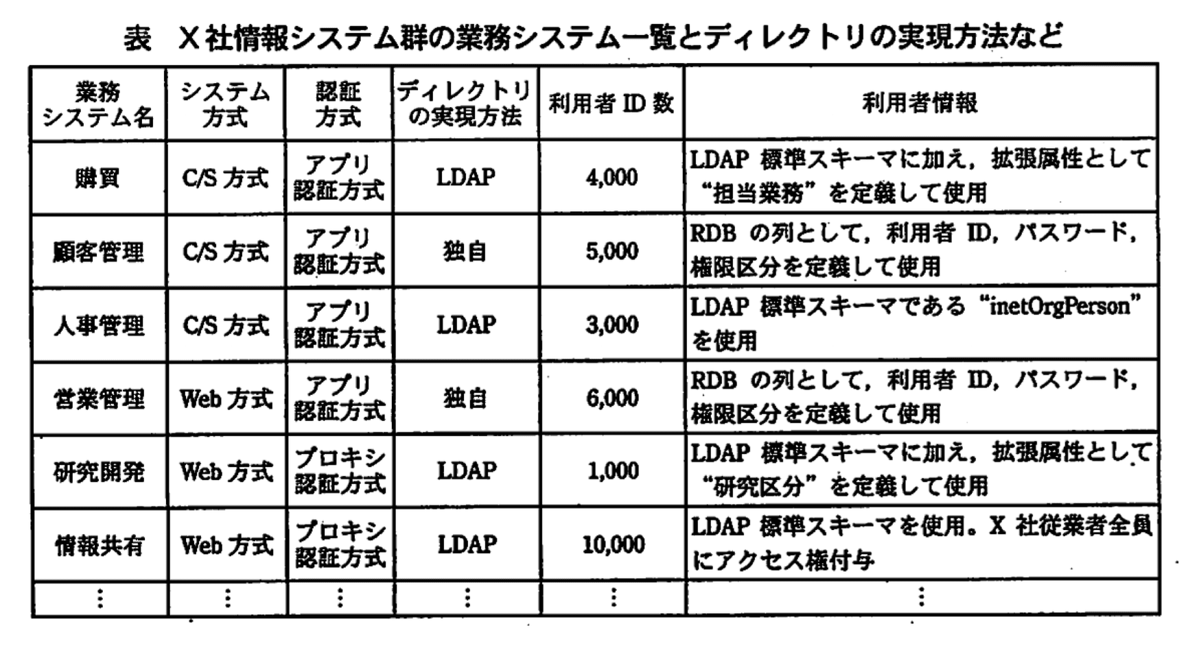現在のX社情報システム群の業務システム名、システム方式、認証方式、ディレクトリの実現方法、登録されている利用者ID数及び利用者情報を表に示す。