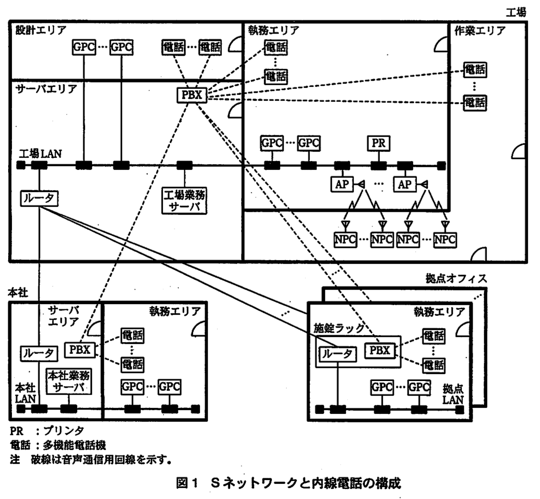 Sネットワークは、本社業務サーバが接続された本社LAN、工場業務サーバが接続された工場LAN、拠点LAN及びこれらのLANを接続するデータ通信用の専用線で構成されている。Sネットワークと内線電話の構成を図1に示す。Sネットワークで取り扱う情報には、機密情報が含まれる。本社LAN及び拠点LANには、各事業所において使用する業務用のPC(以下、GPCという)が接続されている。工場LANには、工場内で使用するGPCのほかに、無線接続が可能なGPC(以下、NPCという)と無線アクセスポイント(以下、APという)で構成される無線LANが含まれる。