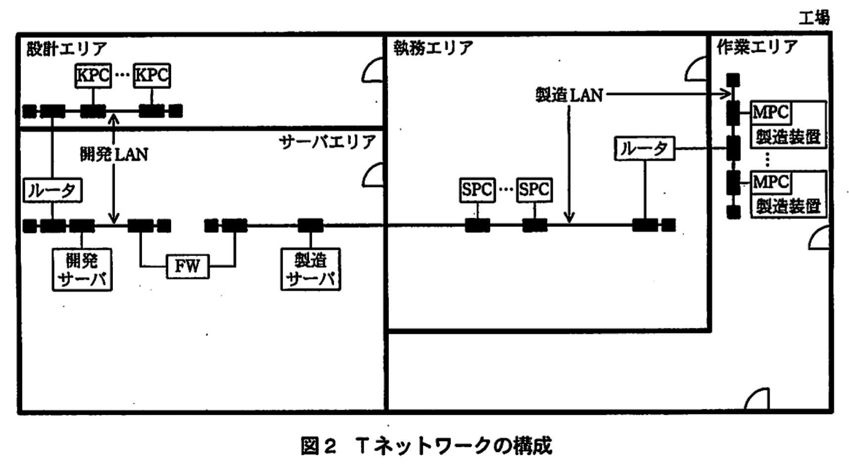 A社では、CADシステムと連動した製造装置を5年前に導入し、設計工程及び製造工程の効率向上を図っている。Tネットワークは、これらの製造装置の導入時に構築されたものであり、開発LAN及び製造LANで構成されている。開発LANには、開発サーバ及び設計エリアのPC(以下、KPCという)が接続されており、開発サーバではCADシステムの製品開発用アプリケーションが稼働している。製造LANには、製造サーバ、執務エリアのPC(以下、SPCという)及び作業エリアの製造装置に組み込まれたPC(以下、MPCという)が接続されている。Tネットワークの構成を図2に示す。