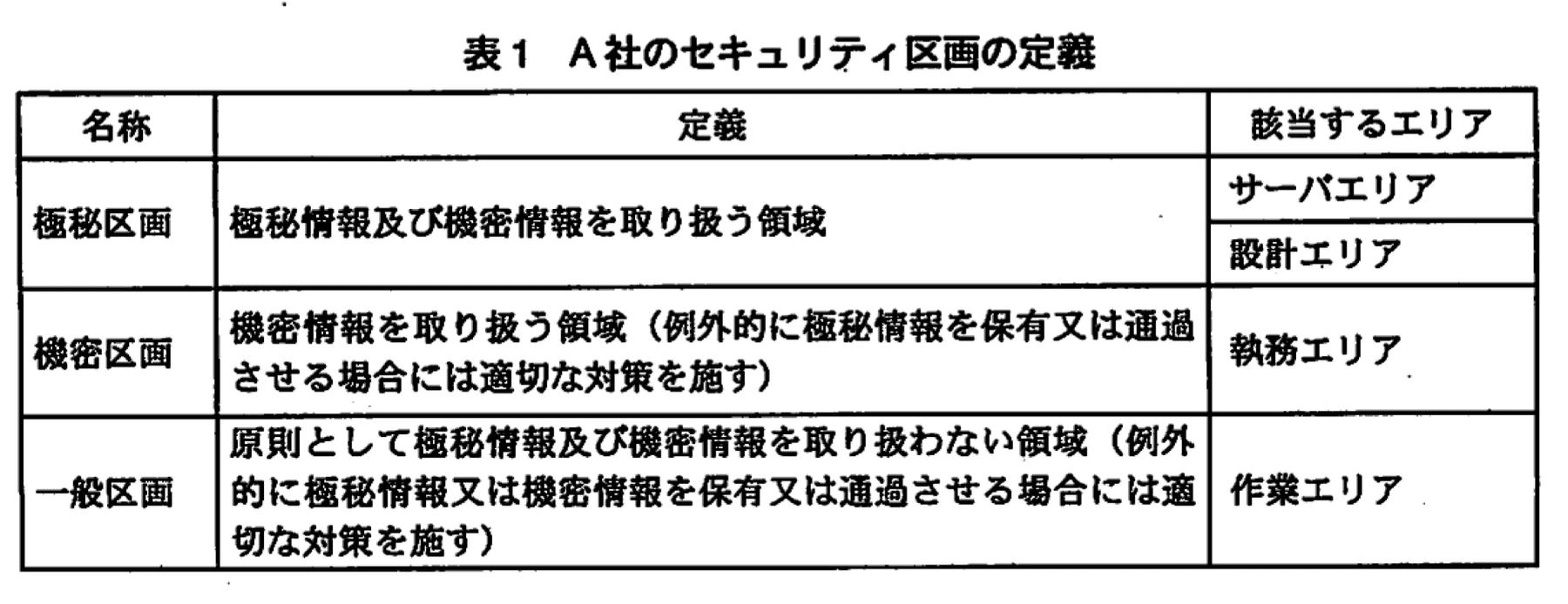 A社のセキュリティ区画の定義を表1に示す。