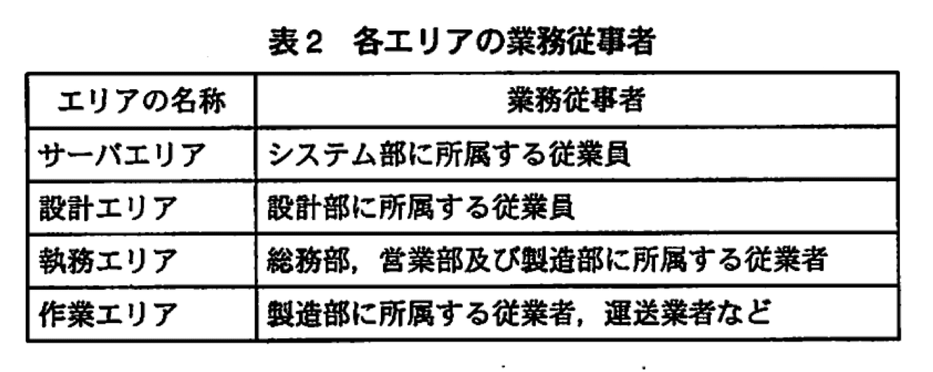 機密区画への立入りは、磁気カードによる認証が必要である。極秘区画への立入り及び退出の際には、磁気カードによる認証に加えて指紋認証も必要である。一般区画への立入りについては、特別な認証制限を行っていないが、工場においては、敷地外から敷地内に入る際に、外来受付で従業員証又は入構証の提示による入構管理を行っている。従業員証と入構証のどちらも保持していない場合には、その都度、臨時の入構証が発行される。各エリアの業務従事者を表2に示す。