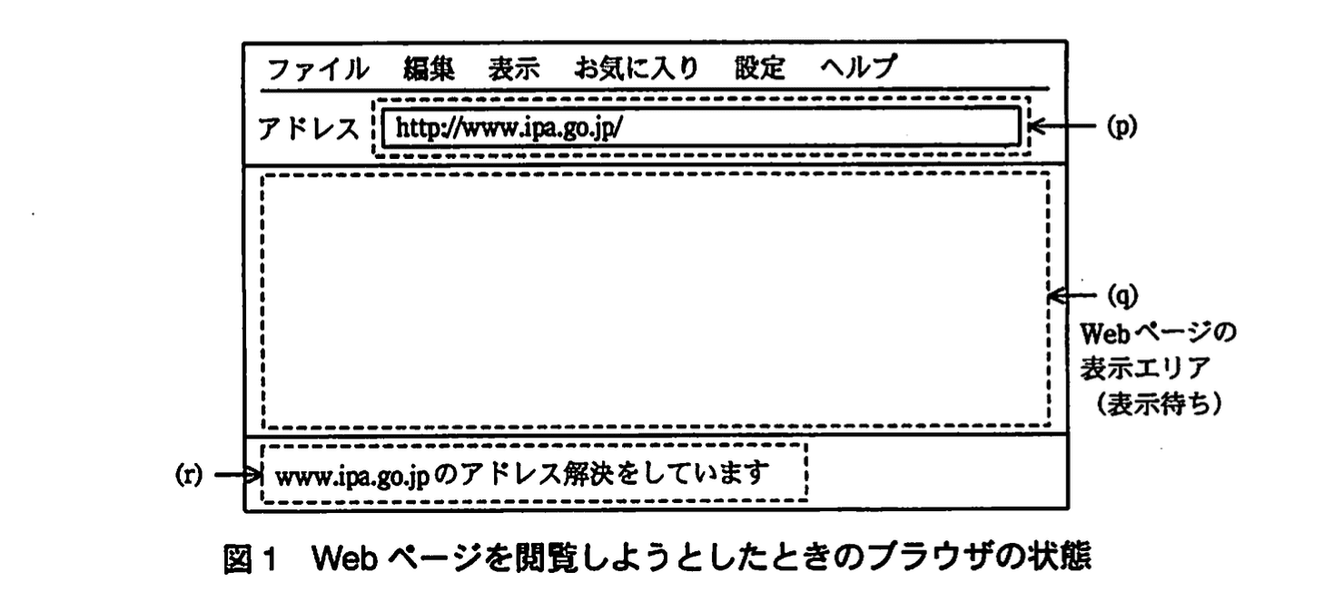 - (q) は Web ページの“表示エリア”で、描画が終わっていない状態を示すだけで DNS か HTTP かまでは分かりません。
