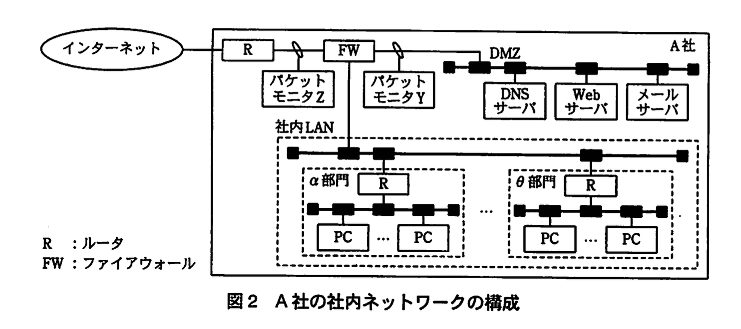 J主任:なるほど、図1中のaを見ると、DMZ上のDNSサーバに問題があるようです。当社の社内ネットワークの構成は図2のとおりです。設置してあるパケットモニタの、該当する時間帯のログを解析してみましょう。
