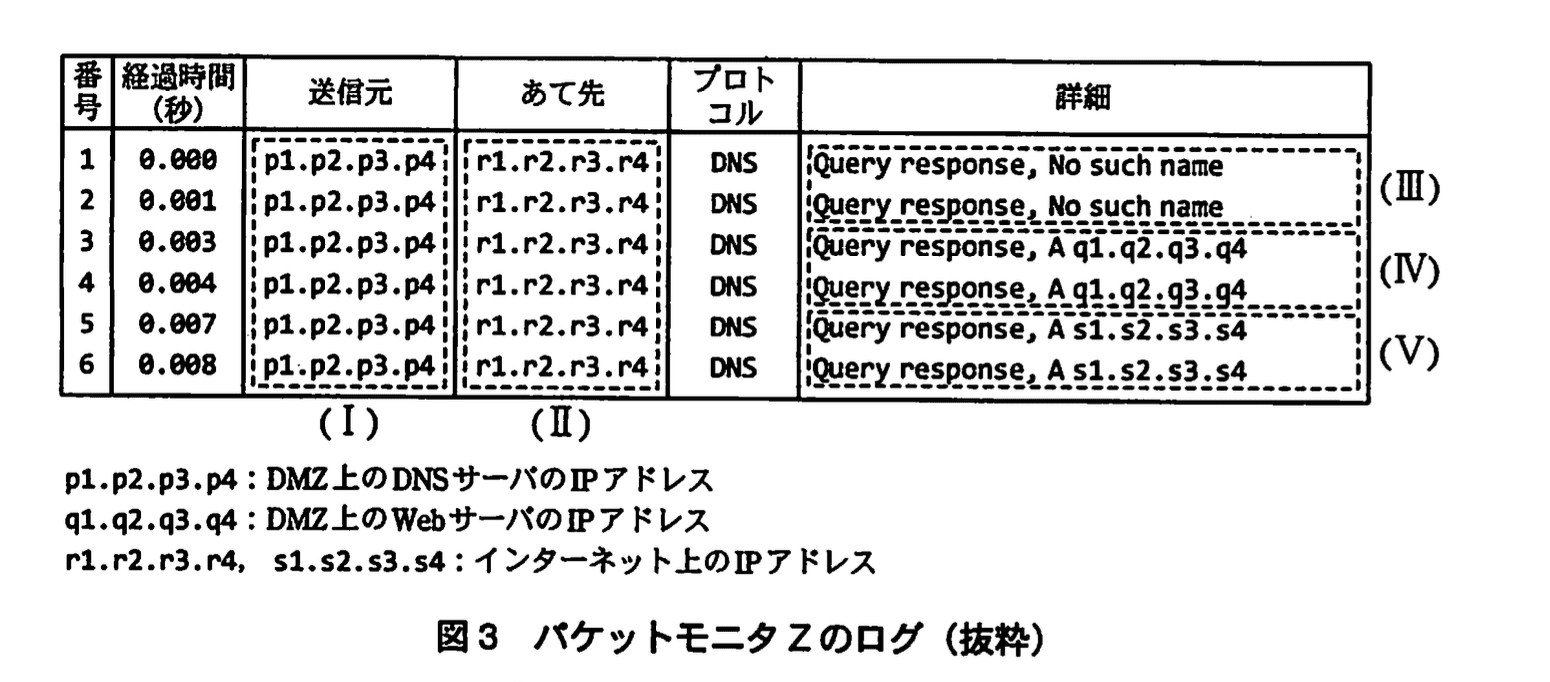 パケットログ解析に関する次の記述を読んで、設問1~3に答えよ。