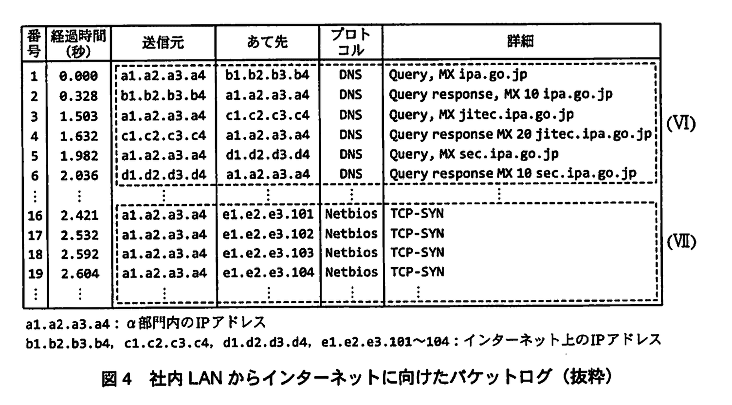 J主任 :②図4中の(VI)に示した箇所に、通常の社内PCには見られない不審な通信挙動が記録されていますね。これはgにおけるアドレス探索に見られる特徴です。また、図4中の(VII)に示した箇所にも、不審な通信挙動が記録されていますね。(VII)に示す通信によって、③通信の異常な偏りが発生します。