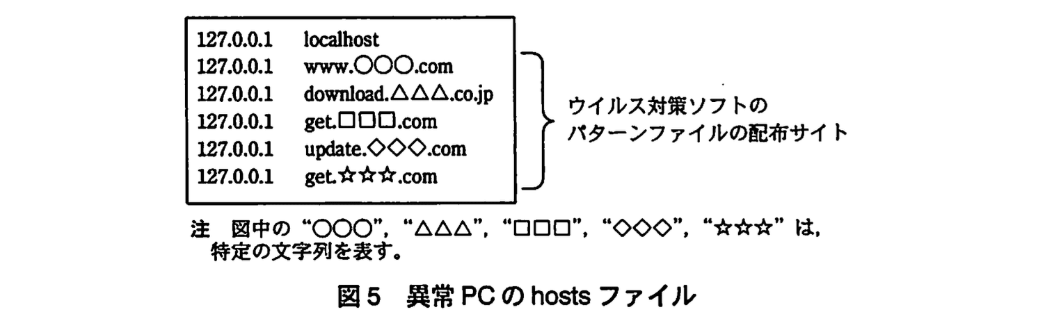 引用:【図5】2~6行目「127.0.0.1 www.OOO.com」「127.0.0.1 download.△△△.co.jp」…(右側に “ウイルス対策ソフトのパターンファイルの配布サイト” と注記) - つまり、本来なら外部の「パターンファイルの配布サイト」へアクセスしに行くための通信が発生するはずであり、それが「TCP/UDPパケットは自動的に発信されます」の具体例となります。