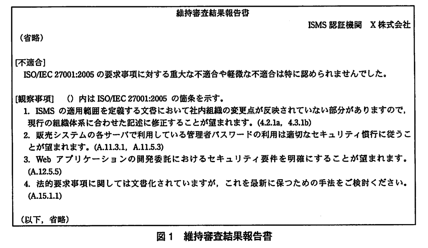P社は先ごろISMS認証の維持審査に合格したが、この審査において四つの観察事項を指摘された。ISMS認証機関から提示された維持審査結果報告書を図1に示す。