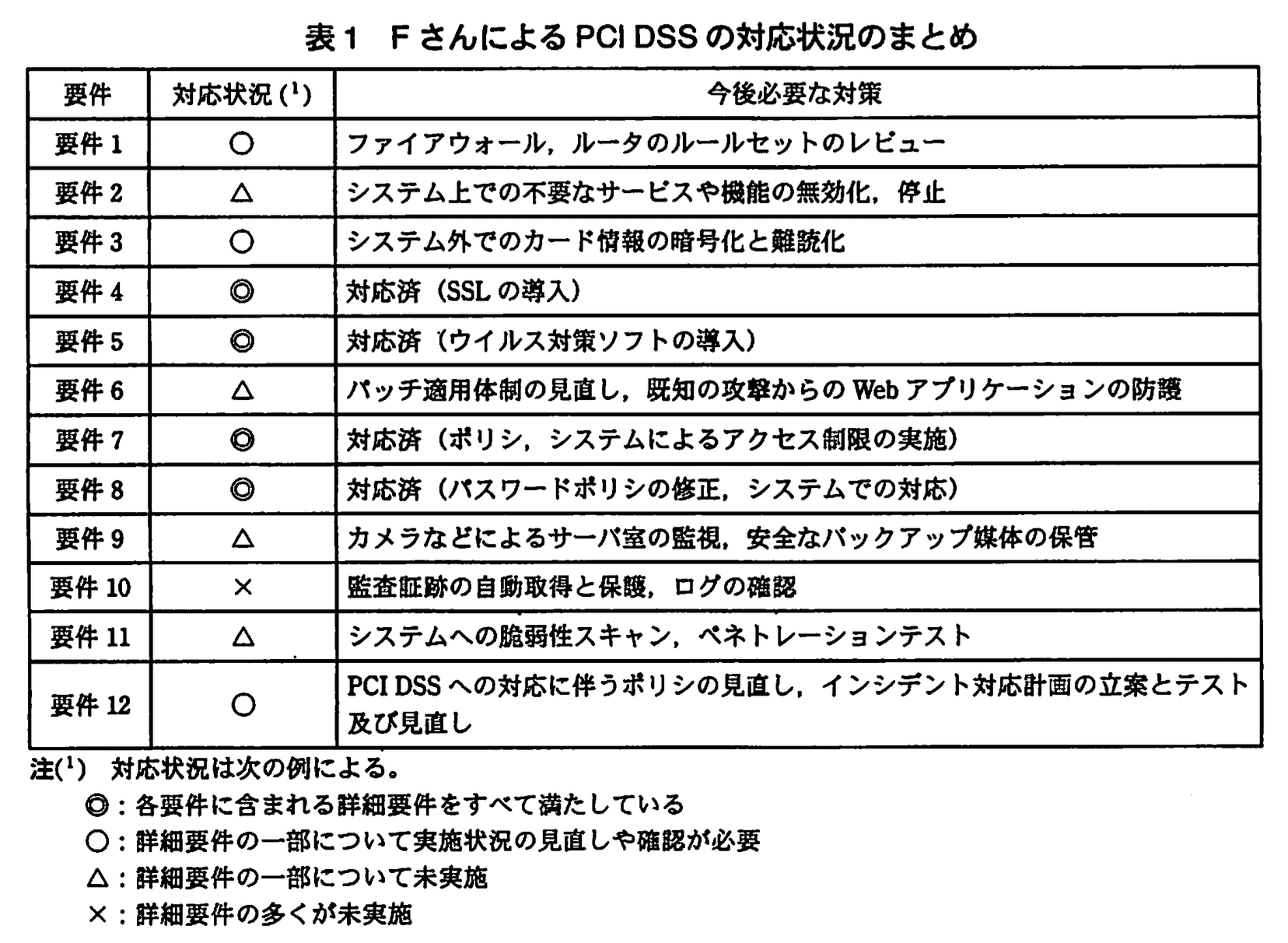 Fさん:PCI DSSの各要件への対応状況ですが、私の考えで12個の要件ごとに現在の状況を表1のようにまとめてみました。