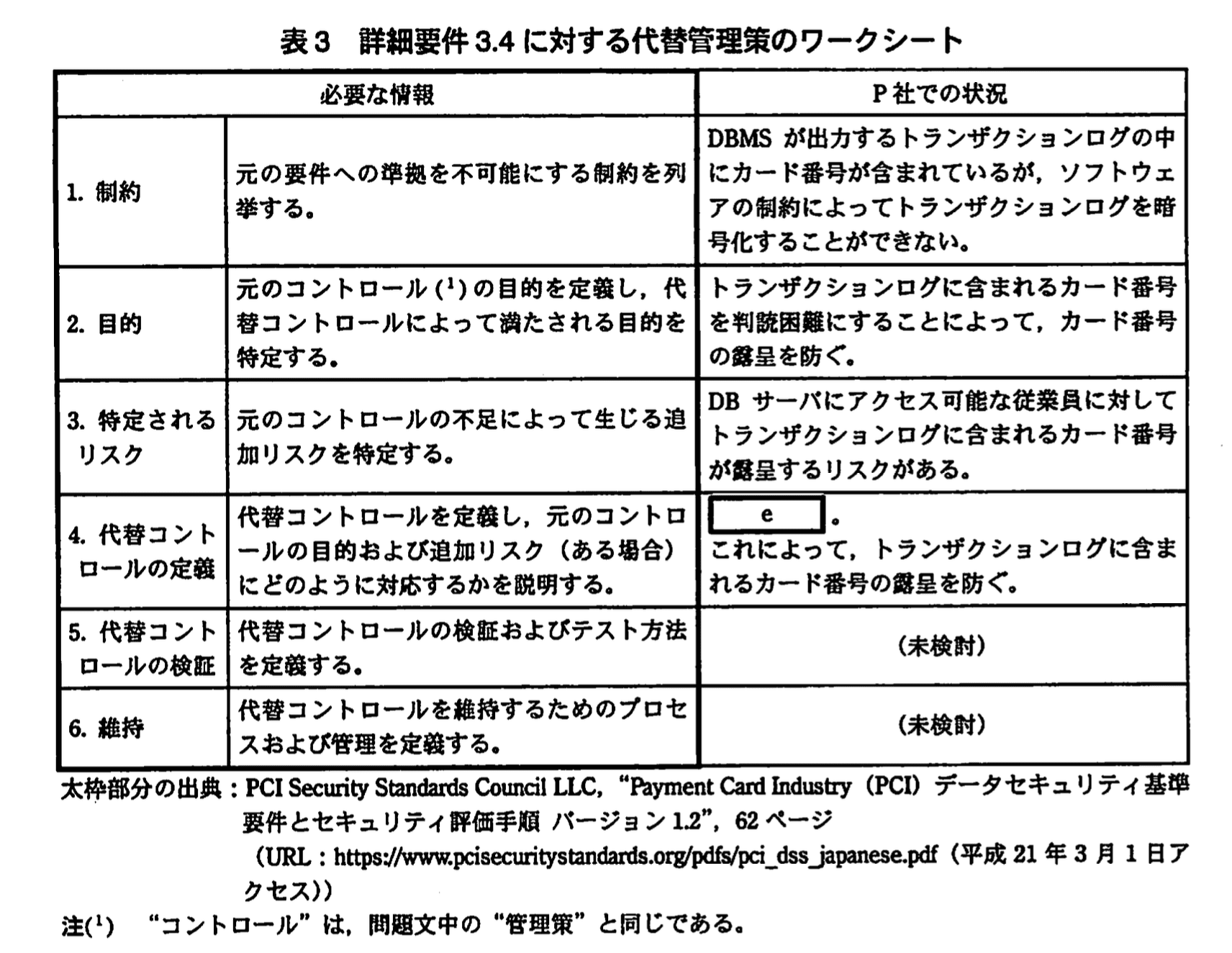 Fさん:要件を満たせない場合でも、関連するリスクをほかの手段を適用することでdできる場合には、その手段を代替管理策とすることで、要件の目的を実現することが可能です。PCI DSSでは、表3に示すようなワークシートを使って、要件が満たされないことに対するリスクを管理するそうです。まだ検討の途中ですが、このような形になるかと思います。