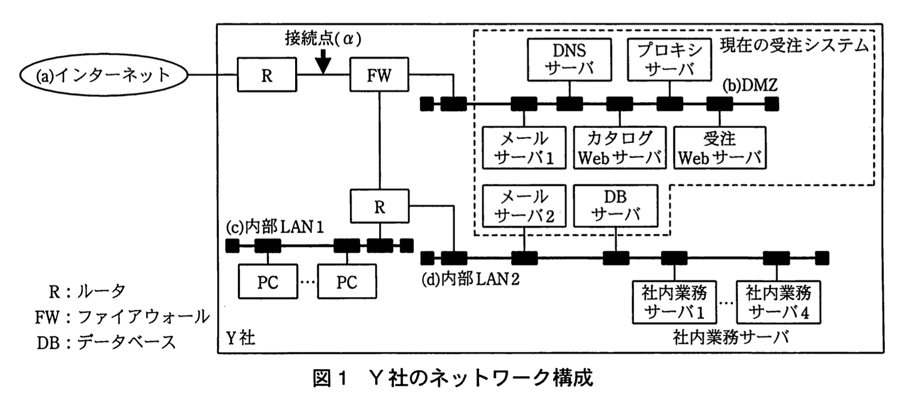 Y社のネットワーク構成を図1に示す。従業員による社内業務サーバの利用、電子メール(以下、メールという)の送受信及びプロキシサーバ経由のインターネットWebサイトの閲覧のためにPCを設置している。