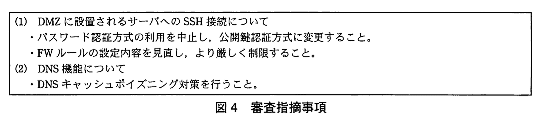 M主任とNさんは、DMZに設置されるサーバへの接続についての審査指摘事項を確認した。指摘を受ける前、Nさんは、サーバへの接続は、SSHによって通信が暗号化されること及び推測しにくいパスワードを使用していることから、パスワード認証方式でもセキュアであると考えていた。しかし、コンピュータセキュリティインシデント対応機関から発表されたSSHサーバへのパスワード総当たり攻撃についての注意喚起においては、パスワードが推測される可能性が高いと説明されていた。そのため、開発Gは、図4の審査指摘事項に従って、SSHの認証方式を公開鍵認証方式に設計変更した。