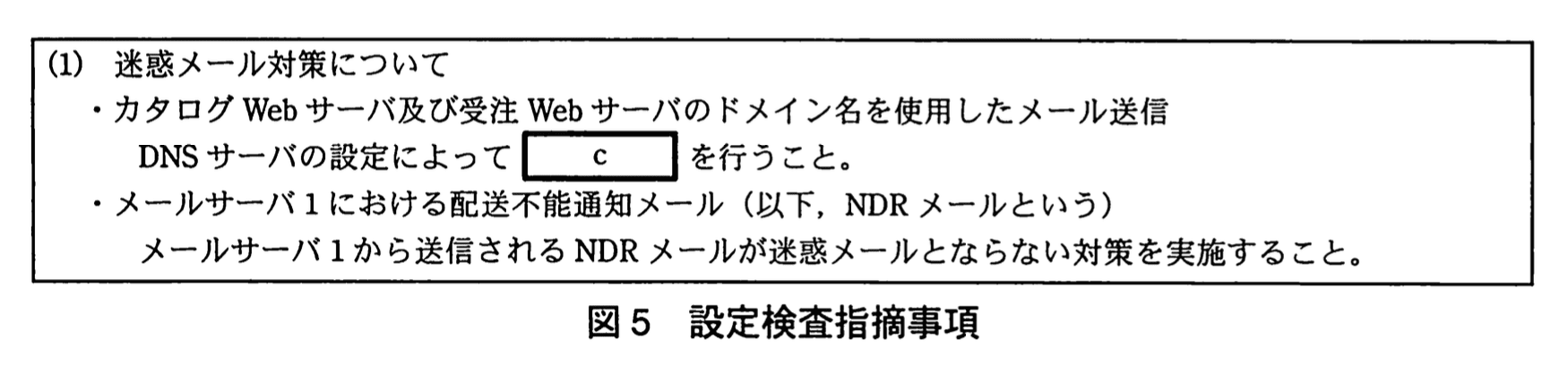 M主任とNさんは設定検査指摘事項について検討を行った。次は、迷惑メール対策について検討した際の会話である。
