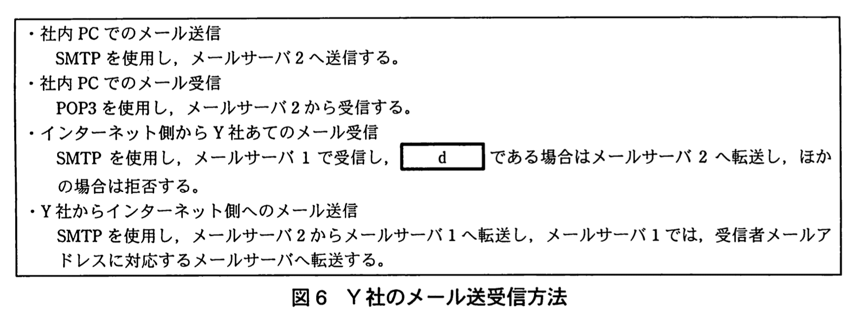 Nさん:メールの送受信方法は図6のとおりで、④メールサーバ1ではオープンリレー防止設定がされているので、そのメールは転送拒否されます。