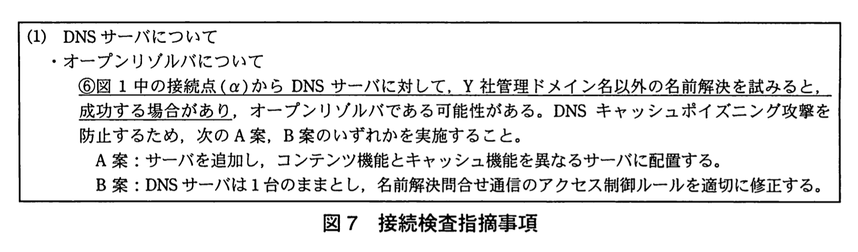 これは審査指摘「⑥図1中の接続点(α)からDNSサーバに対して、Y社管理ドメイン名以外の名前解決を試みると、成功する場合があり…」を是正し、外部からの再帰的利用を遮断しつつ内部(DMZ)からは許可するという設計意図と一致します。 -