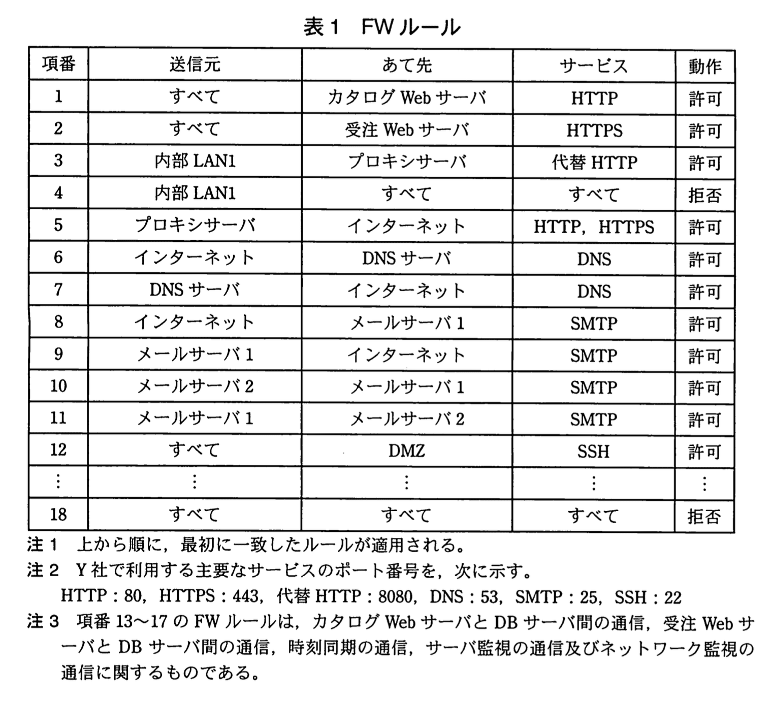 FWのフィルタリングルール(以下、FWルールという)では、通信パケットの送信元、あて先及びサービスの組合せによって、許可又は拒否の動作を指定することができる。FWルールを表1に示す。