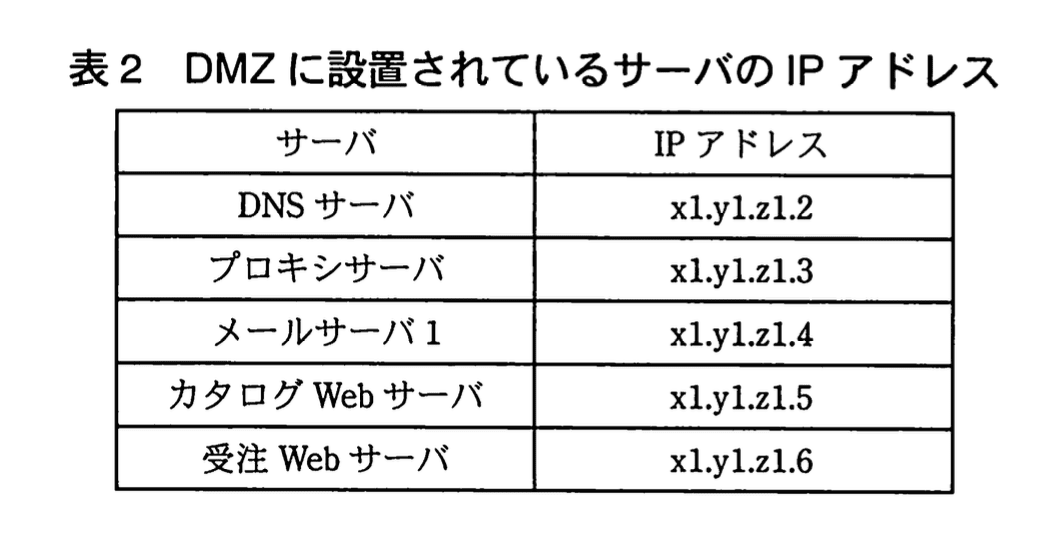 DMZに設置されているサーバのIPアドレスは表2のとおりである。