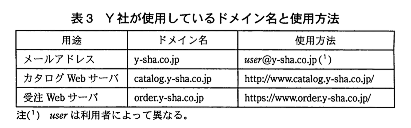 Nさん:当社では表3のとおり、三つのドメイン名(以下、Y社管理ドメイン名という)を使用しています。カタログWebサーバ及び受注Webサーバに使用するドメイン名を使ったメールの送信は一切ありません。cを行うことという設定検査指摘事項の必要性がよく理解できません。