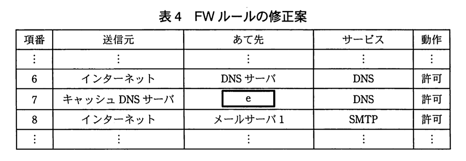 表4の修正案では、「キャッシュDNSサーバ」→e の通信について