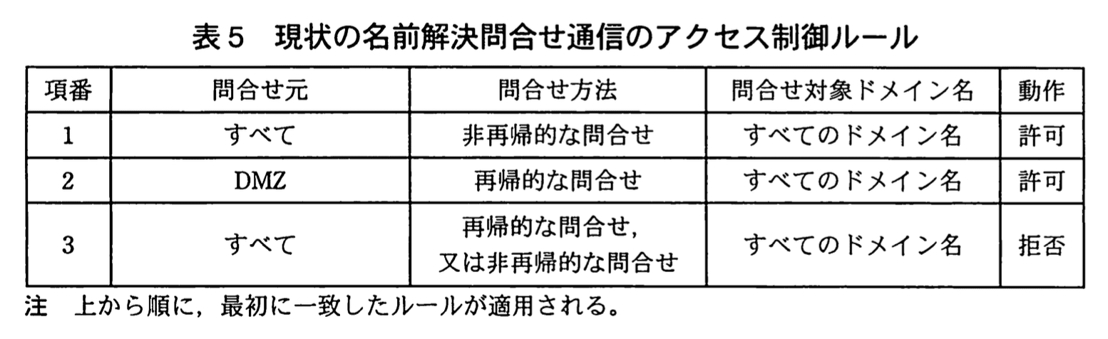 ・権威 DNS(「DNSサーバ」)には外部からの非再帰問い合わせのみを許可(表4 項番6)
