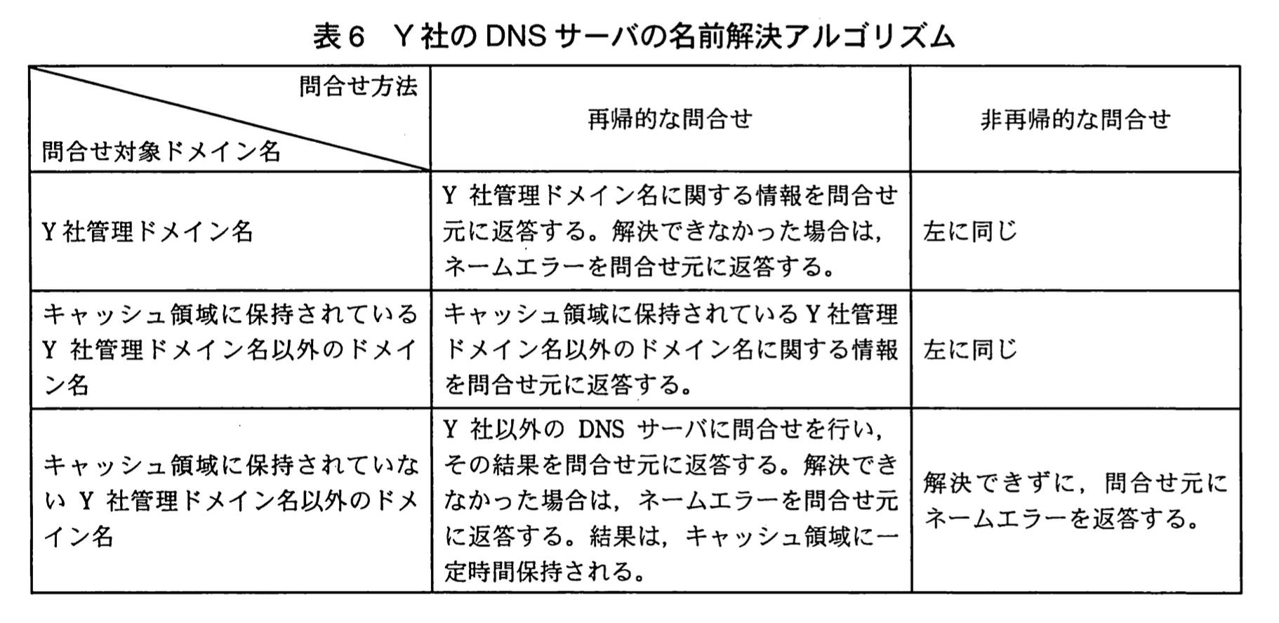 とあり、非再帰的問合せは無条件で DNS サーバに到達できます。 - 動作が許可された場合 DNS サーバは表6のアルゴリズムを実行します。表6の2行目には