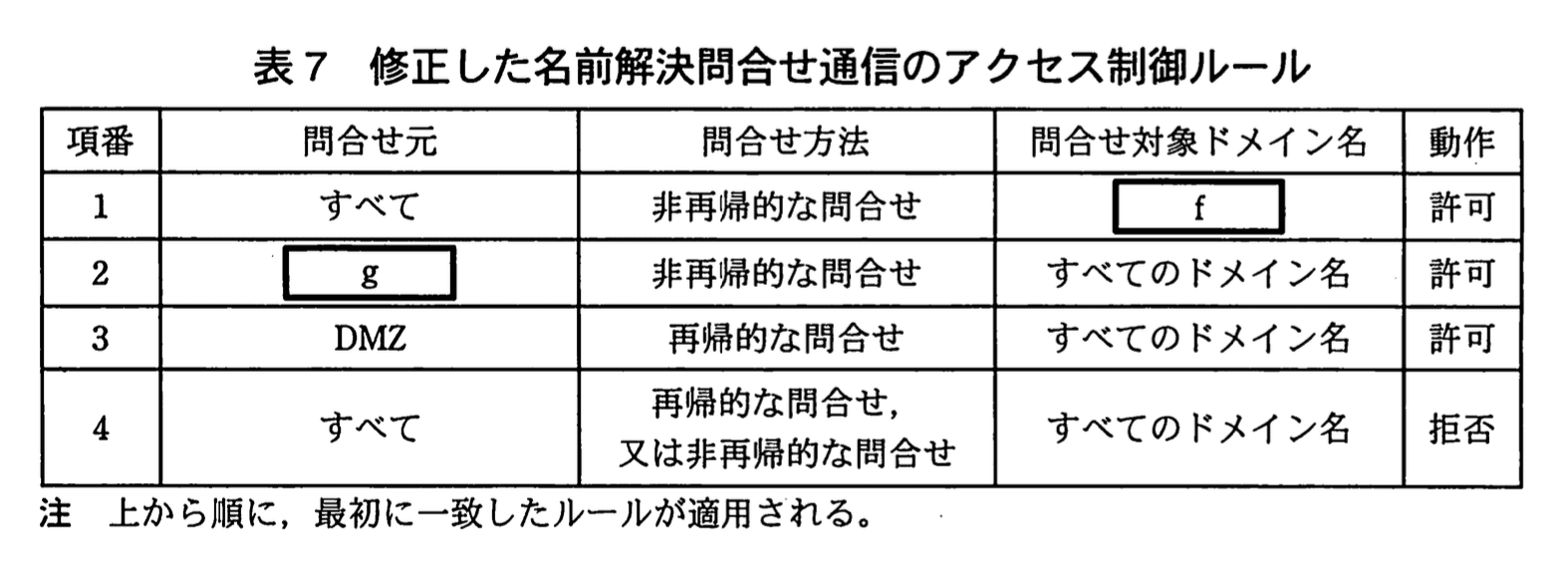表7ではアクセス制御ルールの優先順位を「注 上から順に、最初に一致したルールが適用される。」と明示しています。したがって、最初の許可ルールで“誰に・何を”許すかが鍵です。 -