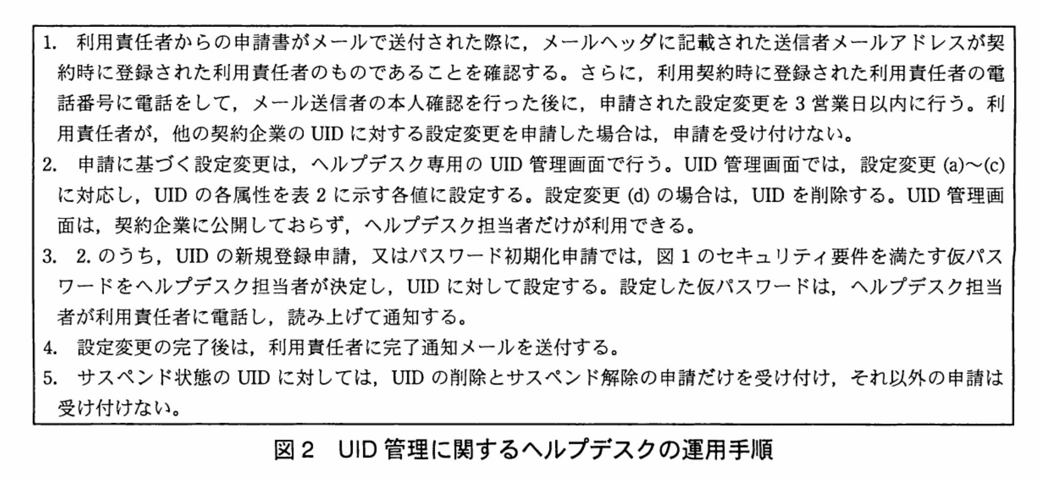 - 図1のセキュリティ要件には「(カ)90日間ログインに成功していないUIDは、ログイン不可能になる。このUIDの状態をサスペンド状態と呼ぶ。サスペンド状態は、契約企業の利用責任者からのサスペンド解除申請によってだけ解除でき、利用者自身では解除できないようにする。」とあります。