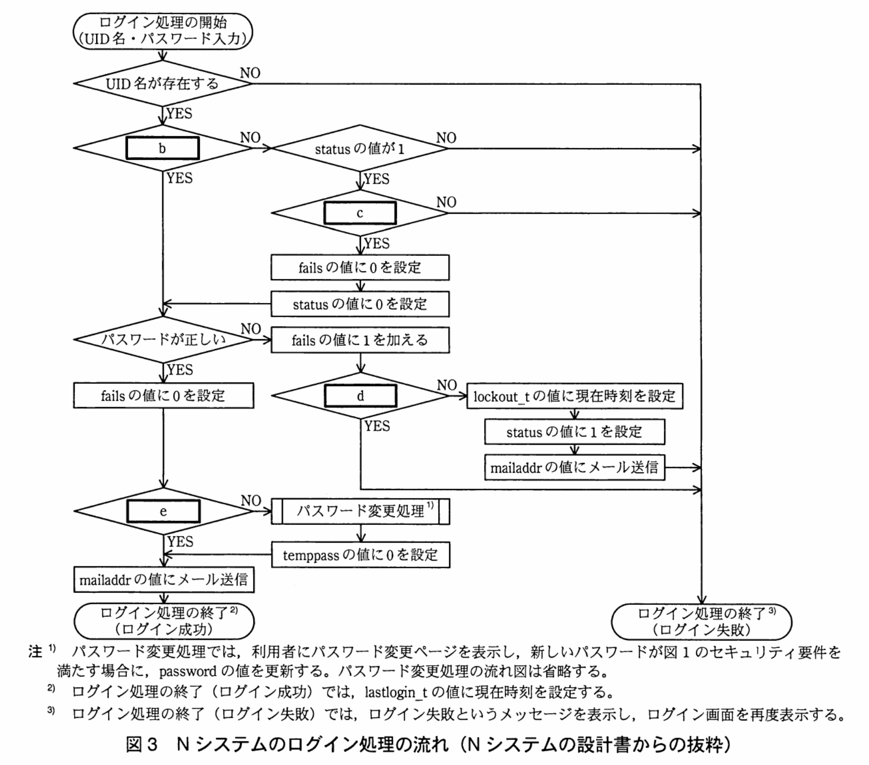 また、Nシステムのログイン画面で、UID名とパスワードが入力された場合のログイン処理の流れを図3に示す。ログイン成功時とロックアウト発生時に、利用者にメールで通知することで、不正ログイン及びその試行を利用者が把握できるようにしている。