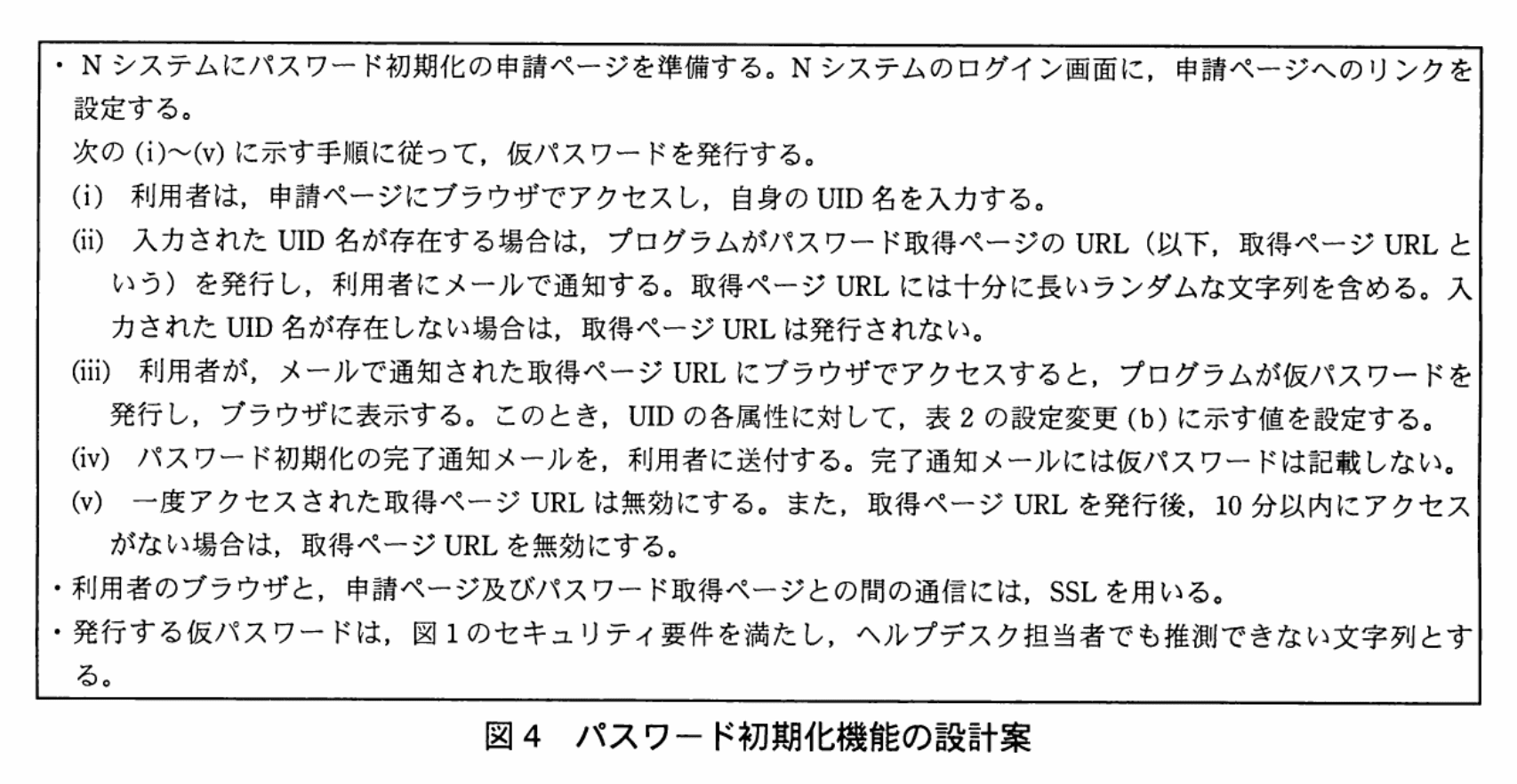 F君は、図1に示すセキュリティ要件に従って、Nシステムのパスワード初期化機能を検討した。F君が作成した設計案を、図4に示す。