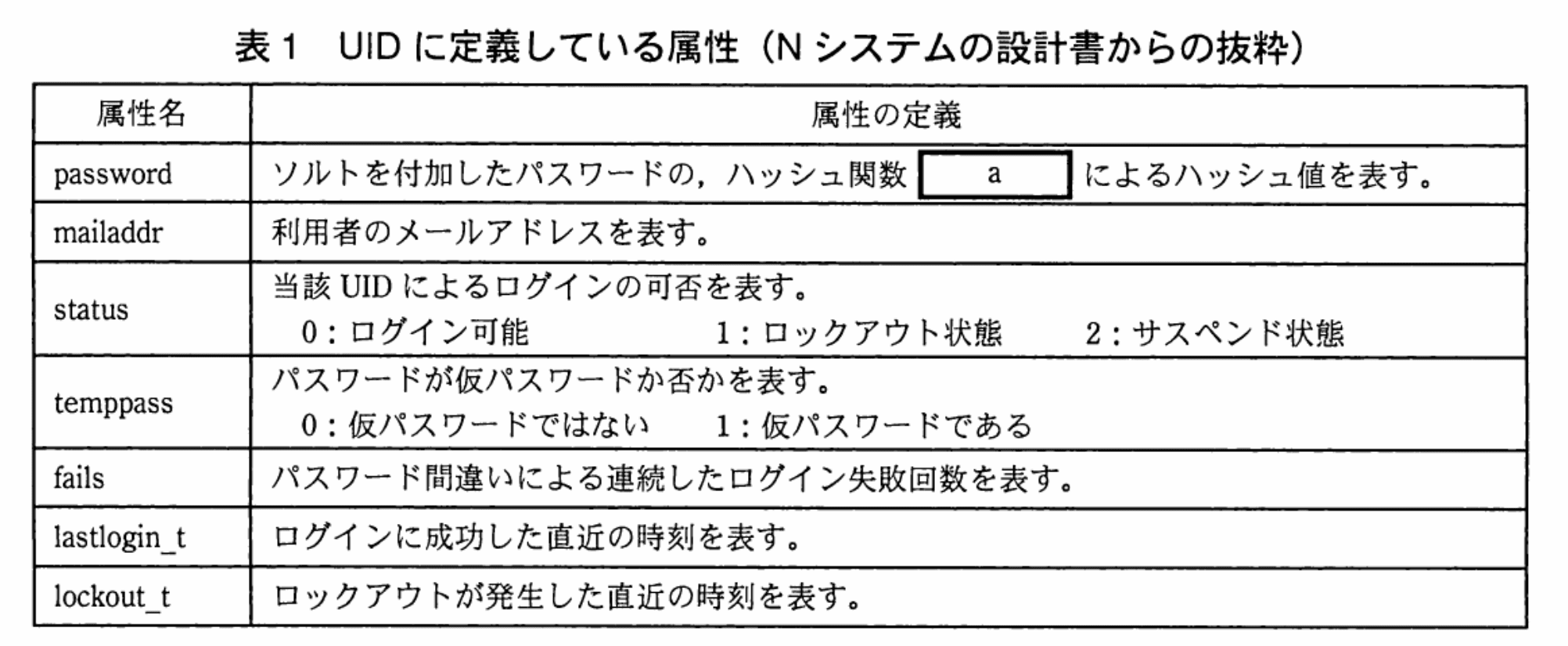 Nシステムでは、UIDに対して表1に示す属性を定義し、その値をログイン処理に利用している。NシステムのUID及びログイン処理に関する、セキュリティ要件は図1のとおりである。