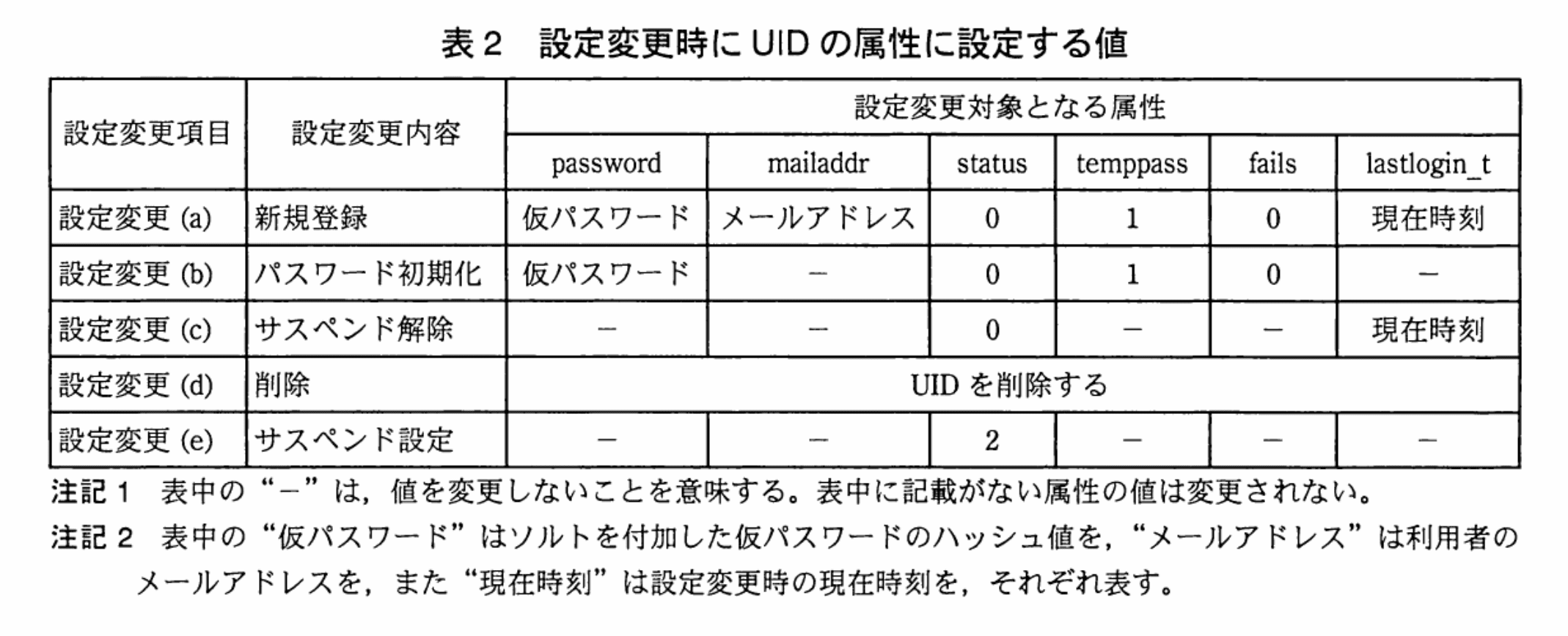 - 表2の「設定変更b」はパスワード初期化時に status の値を 0 にします。