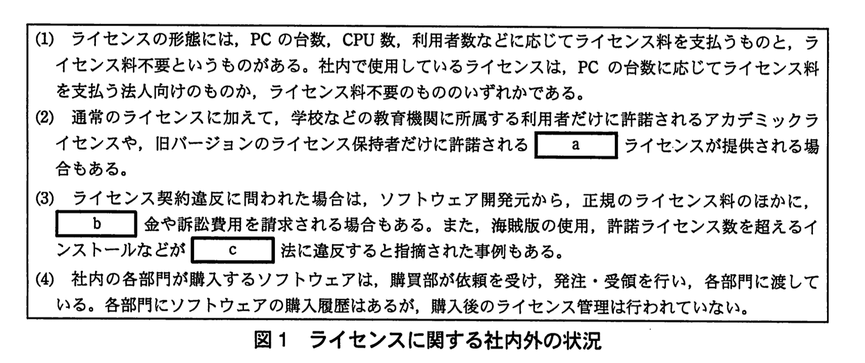 → 各部門でも不足は分かるので設問条件に合わない。 - 「ライセンス契約違反の有無」と答える
