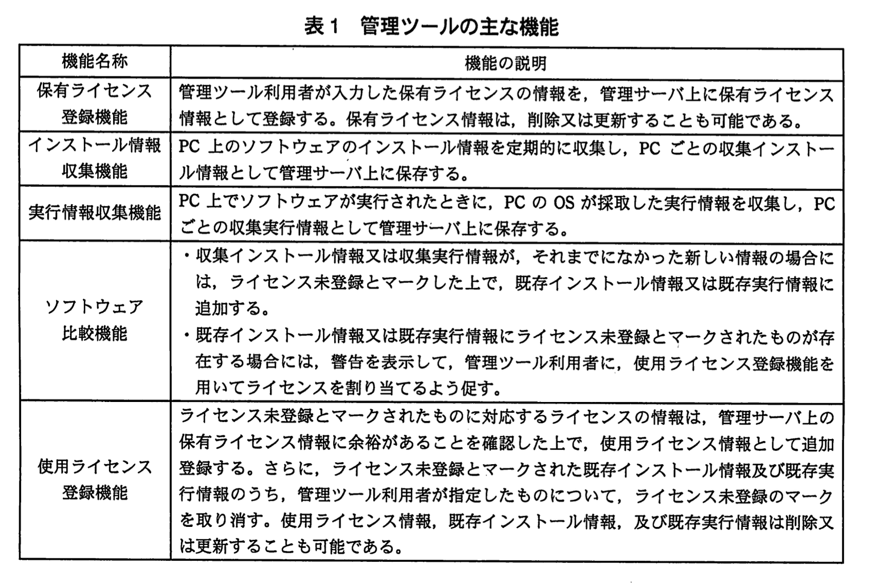 - 一方、管理ツールの「実行情報収集機能」は「PC上でソフトウェアが実行されたときに、PCのOSが採取した実行情報を収集し、PCごとの収集実行情報として管理サーバ上に保存する。」と明記されています。