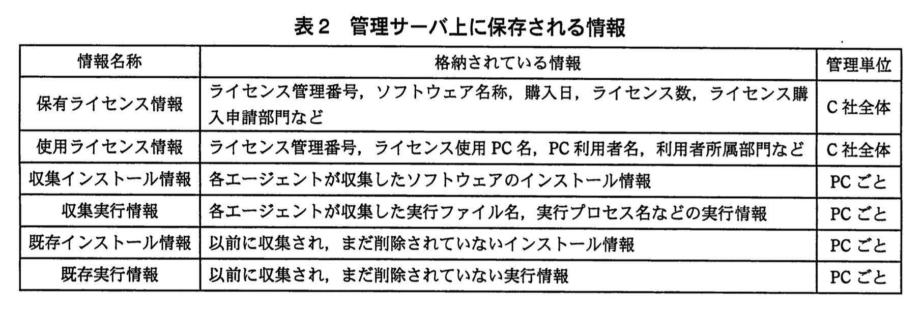 U主任は、①インストール情報が記録されないソフトウェアがあることや、インストール情報を書き換えてソフトウェアの存在を隠ぺいするツールがインターネット上に存在していることなどから、インストール情報による調査では把握できないソフトウェアが、使用ソフトウェア一覧表以外にもインストールされているおそれがあるとT 部長に報告した。そこで、T 部長は、ソフトウェア資産管理ツール(以下、管理ツールという)の導入を経営陣に提案し、承認を得て実行に移した。管理ツールは、保有ライセンスとソフトウェアの使用状況を管理するためのものであり、管理サーバに導入するサーバプログラムと、PC に導入するエージェントで構成されている。管理ツールの主な機能を表1に、管理サーバ上に保存される情報を表2にそれぞれ示す。