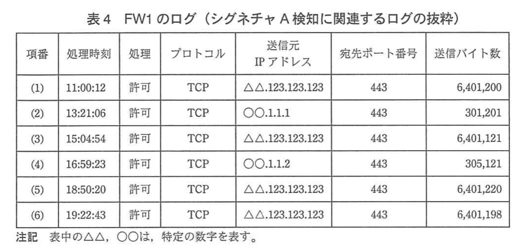 ・「11:00:12」「15:04:54」「18:50:20」「19:22:43」に送信元 IP「△△.123.123.123」から通信があり、 送信バイト数はいずれも「6,401,200」前後の極端に大きな値です。