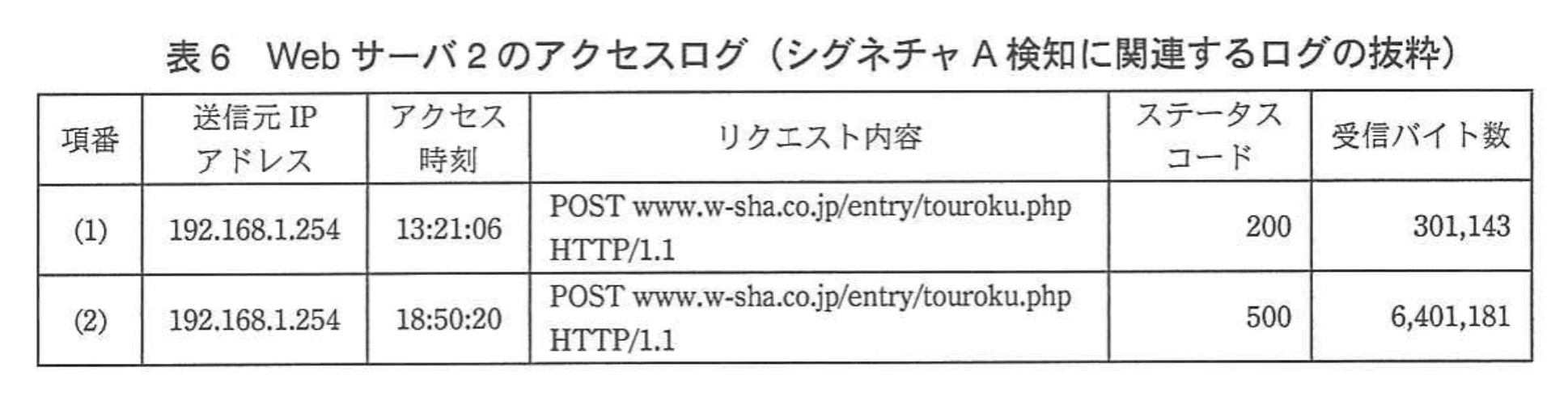 など “6,401,xxx” バイト級であり、Webサーバのステータスコードが “500” です。 - ところが IDS が検知した中には、表3 [4] “16:59:23” に対応する表5 [3] のアクセスがあり、これは受信バイト数 “305,071” と閾値ぎりぎりである一方、ステータスコードは “200” と正常応答です。