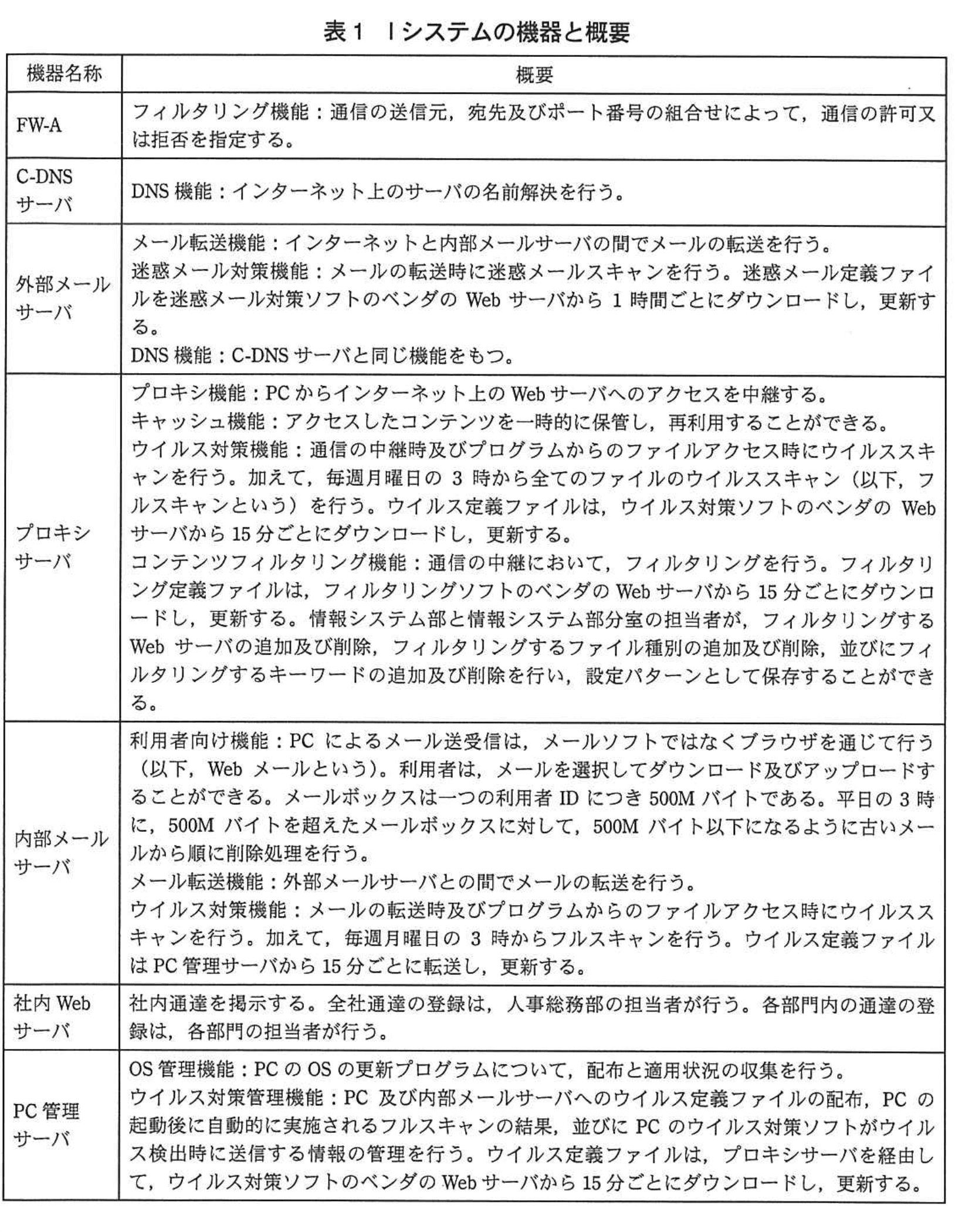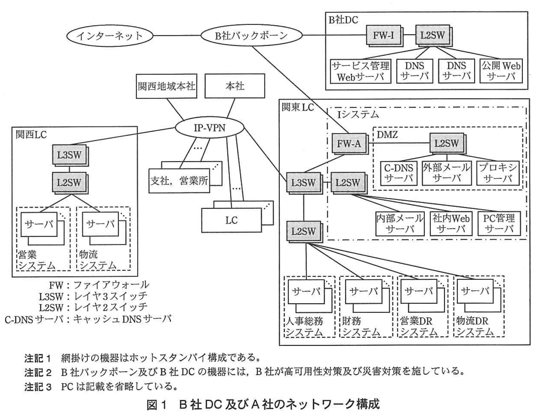 A社では、DNSサーバ、公開Webサーバなどの運用に、ISPのB社が提供するデータセンタ(以下、B社DCという)を利用している。B社DC及びA社のネットワーク構成を図1に、Iシステムの機器と概要を表1に、B社DCの機器と概要を表2に示す。