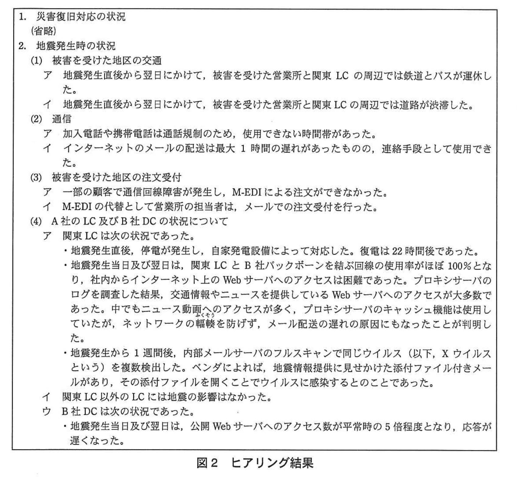 情報システムの再構築から半年後、月曜日の午前中に関東地方で強い地震が発生した。A社では、関東地区の一部の営業所と関東LCが被害を受け、業務遂行に支障が出た。直ちに、本社に災害対策本部を設置し、被害を受けた営業所と関東LCの復旧を行った。復旧のめどがついた1か月後、A社の経営会議は、今回の地震で起きた災害対策の問題点をまとめることを決めた。その決定を受けて、人事総務部長は、社内各部門に災害復旧対応と地震発生時の状況をヒアリングするよう、担当部員に指示した。担当部員がヒアリングした結果を図2に示す。