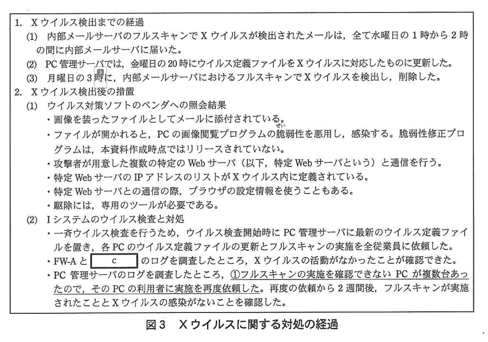 D部長は、情報セキュリティ担当のE主任とFさんに、Xウイルスに関する対処の経過をまとめるように指示した。E主任とFさんは、図3に示すXウイルスに関する対処の経過をD部長に報告した。
