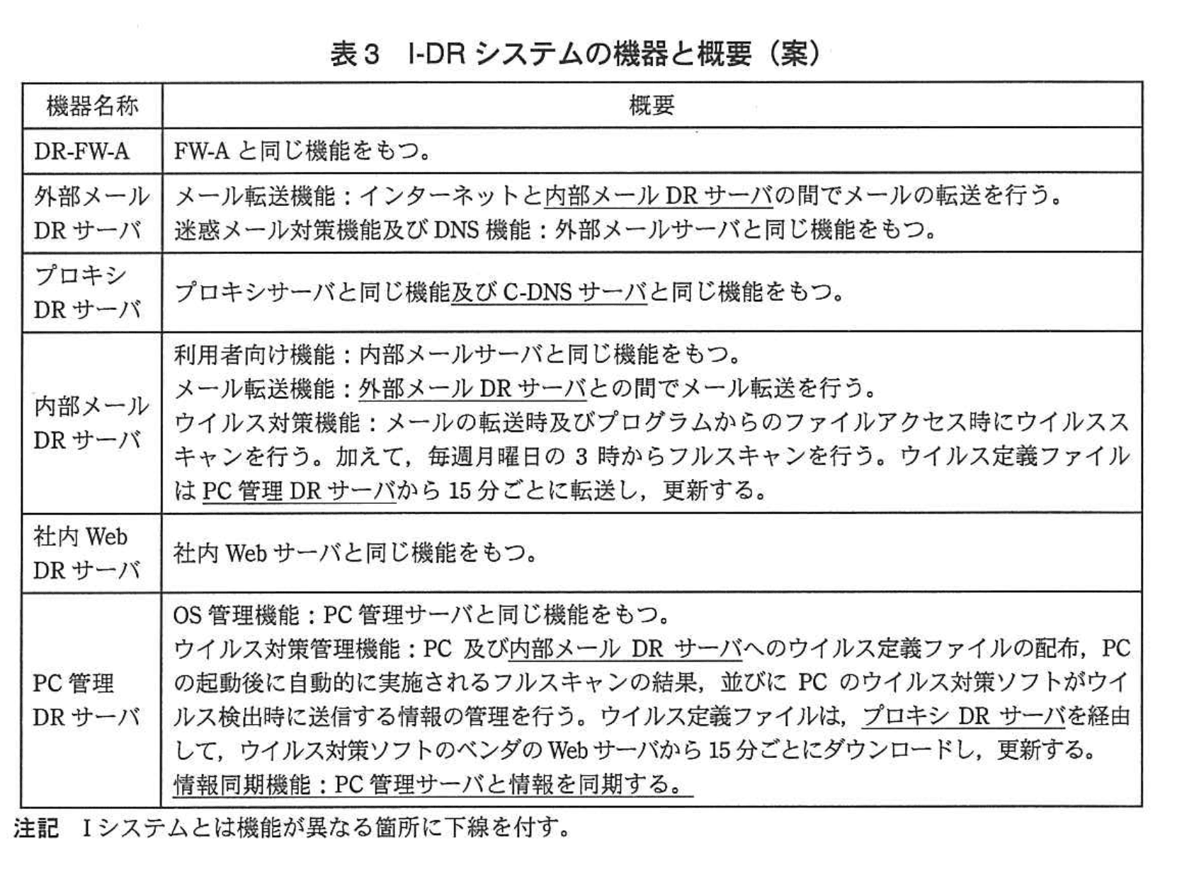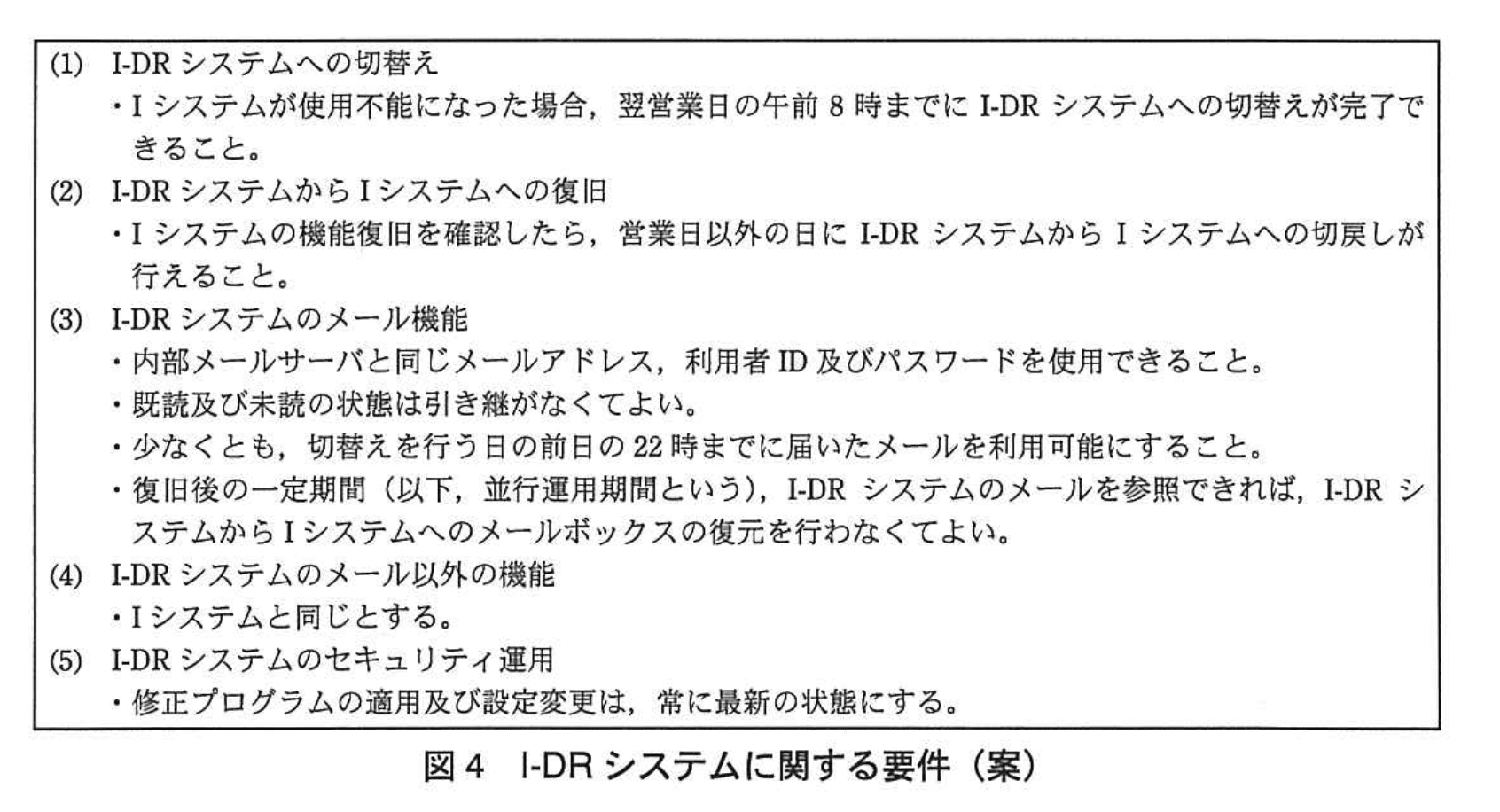 I-DR システムに関する要件の検討は、E主任と Fさん、情報システム部分室の G主任から成る検討チームが行うことになった。業務の継続性の観点から、I-DR システムに関する要件を図4の(案)のように整理した。