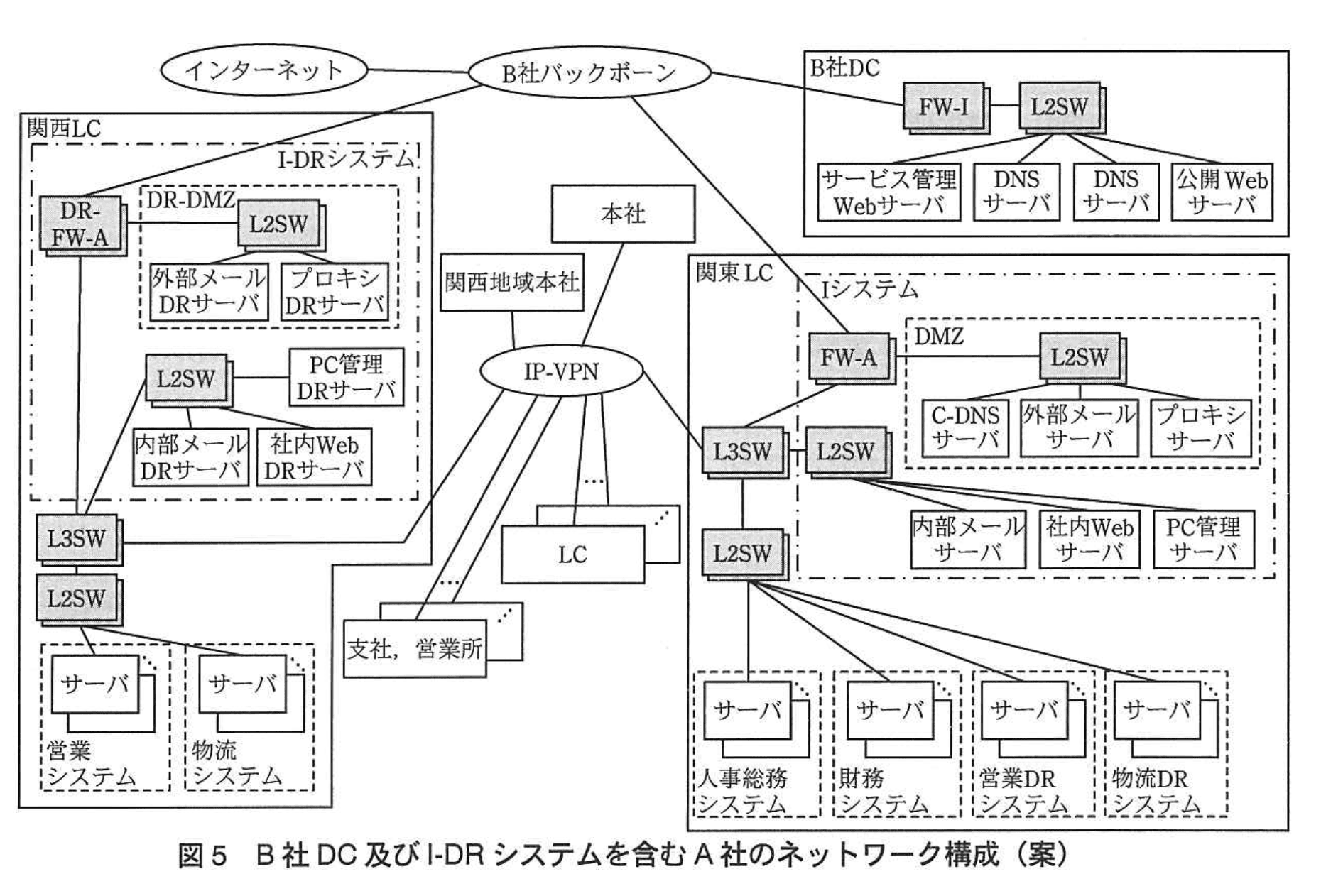 検討チームは、I-DR システムに関する要件(案)を D部長に報告し、承認を得た。続いて検討チームは、図4を基に、図5に示す B社 DC 及び I-DR システムを含む A社のネットワーク構成(案)、並びに表3に示す I-DR システムの機器と概要(案)を作成した。