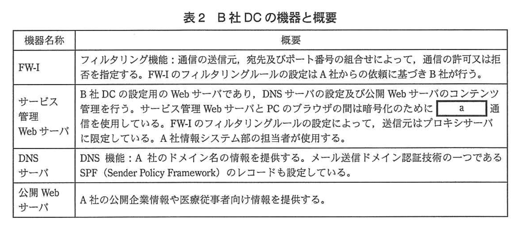 - 【問題文】には「サービス管理WebサーバとPCのブラウザの間は暗号化のためにa通信を使用している。」とあります。